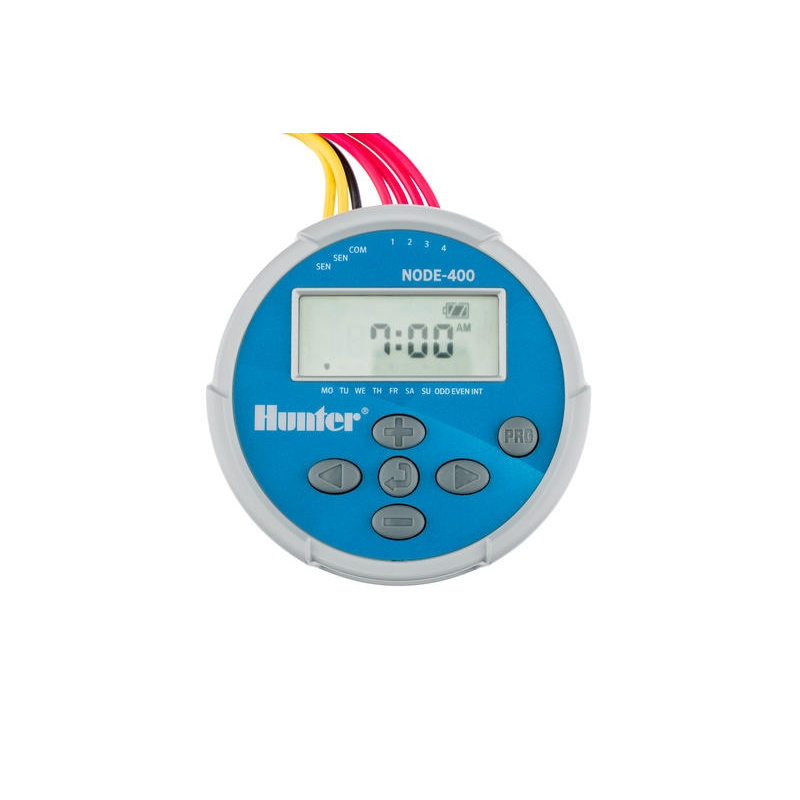 Hunter NODE jest inteligentnym i niezawodnym rozwiązaniem dla miejsc odizolowanych i obszarów o ograniczonym zasilaniu. NODE montuje się do elektrozaworu szybko i łatwo, bez śrub, wierteł czy dodatkowych przewodów. Solidna konstrukcja urządzenia i całkowicie wodoszczelna obudowa zapewniają, że poradzi sobie w trudnych warunkach każdej skrzynki zaworowej. NODE jest zasilany jedną lub dwiema bateriami alkalicznymi 9V i zapewnia standardową lub przedłużoną moc przez cały sezon. Oprócz wyjątkowej niezawodności NODE posiada łatwy do zaprogramowania ekran LCD, możliwość sterowania zaworem głównym pompy i jest szybszy w programowaniu za pomocą prostego kreatora firmy Hunter z 3 programami i 4 czasami startu na program. Różnorodność opcji programowania i wysoka niezawodność sprawiają, że NODE jest kompaktowym, ale potężnym sterownikiem nawadniania z elastycznością baterii lub energii słonecznej.