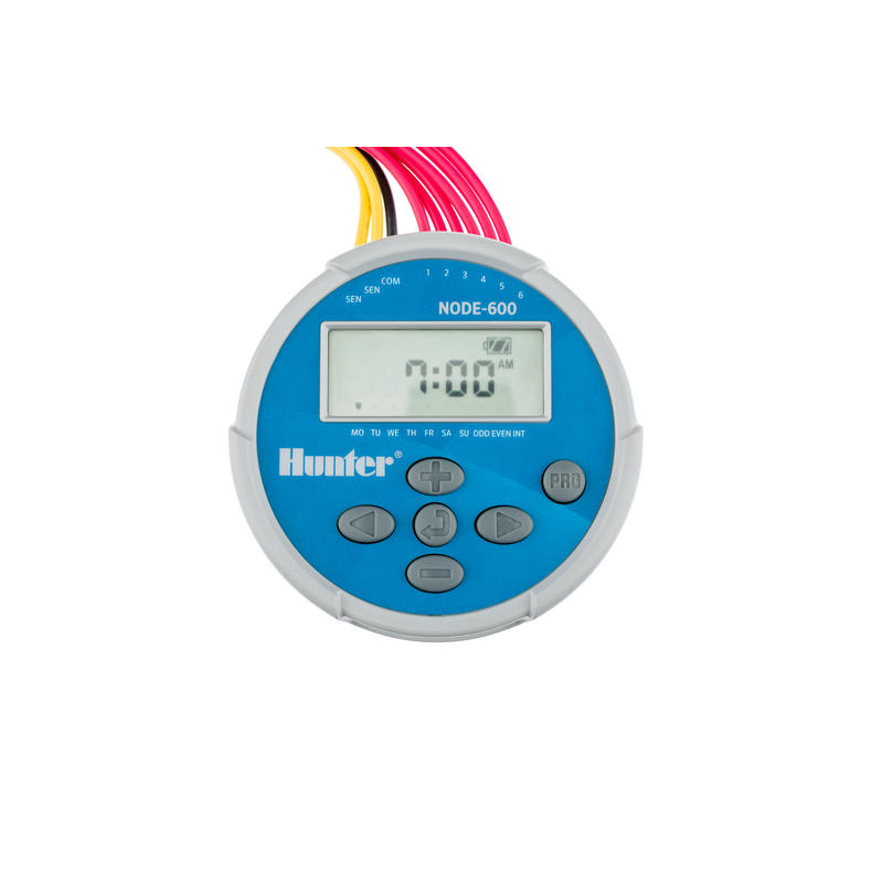 Hunter NODE jest inteligentnym i niezawodnym rozwiązaniem dla miejsc odizolowanych i obszarów o ograniczonym zasilaniu. NODE montuje się do elektrozaworu szybko i łatwo, bez śrub, wierteł czy dodatkowych przewodów. Solidna konstrukcja urządzenia i całkowicie wodoszczelna obudowa zapewniają, że poradzi sobie w trudnych warunkach każdej skrzynki zaworowej. NODE jest zasilany jedną lub dwiema bateriami alkalicznymi 9V i zapewnia standardową lub przedłużoną moc przez cały sezon. Oprócz wyjątkowej niezawodności NODE posiada łatwy do zaprogramowania ekran LCD, możliwość sterowania zaworem głównym pompy i jest szybszy w programowaniu za pomocą prostego kreatora firmy Hunter z 3 programami i 4 czasami startu na program. Różnorodność opcji programowania i wysoka niezawodność sprawiają, że NODE jest kompaktowym, ale potężnym sterownikiem nawadniania z elastycznością baterii lub energii słonecznej.