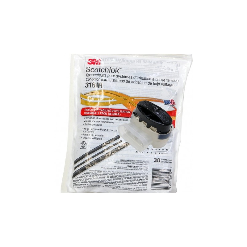 Scotchlok 316 IR zaciskany, żelowany, do systemów irygacyjnych umożliwiają szybkie i niezawodne połączenia lub odgałęzienia jedno- i wielodrutowych przewodów miedzianych na napięcie do 600V przekrojach 0,5mm2- do 4mm2 i maksymalnej średnicy izolacji do 4,8mm. Są wykonane z odpornego na rozpuszczalniki polipropylenu umożliwiającego pracę w temperaturach otoczenia do 105°C opakowanie 30 szt